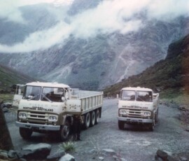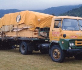 A large Nissan Diesel truck carrying stacked construction supplies, with a driver standing beside it.